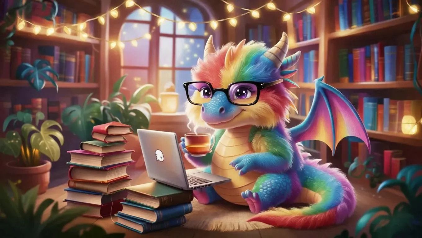 Create AI-generated art of a whimsical rainbow dragon with oversized glasses sipping tea in a cozy, glowing library. Perfect for viral memes, fantasy illustrations, or trendy content. Explore vibrant AI effects to design quirky, dreamy scenes blending mythical creatures with modern humor and bookish charm. Ideal for social media posts, digital art projects, and imaginative storytelling.