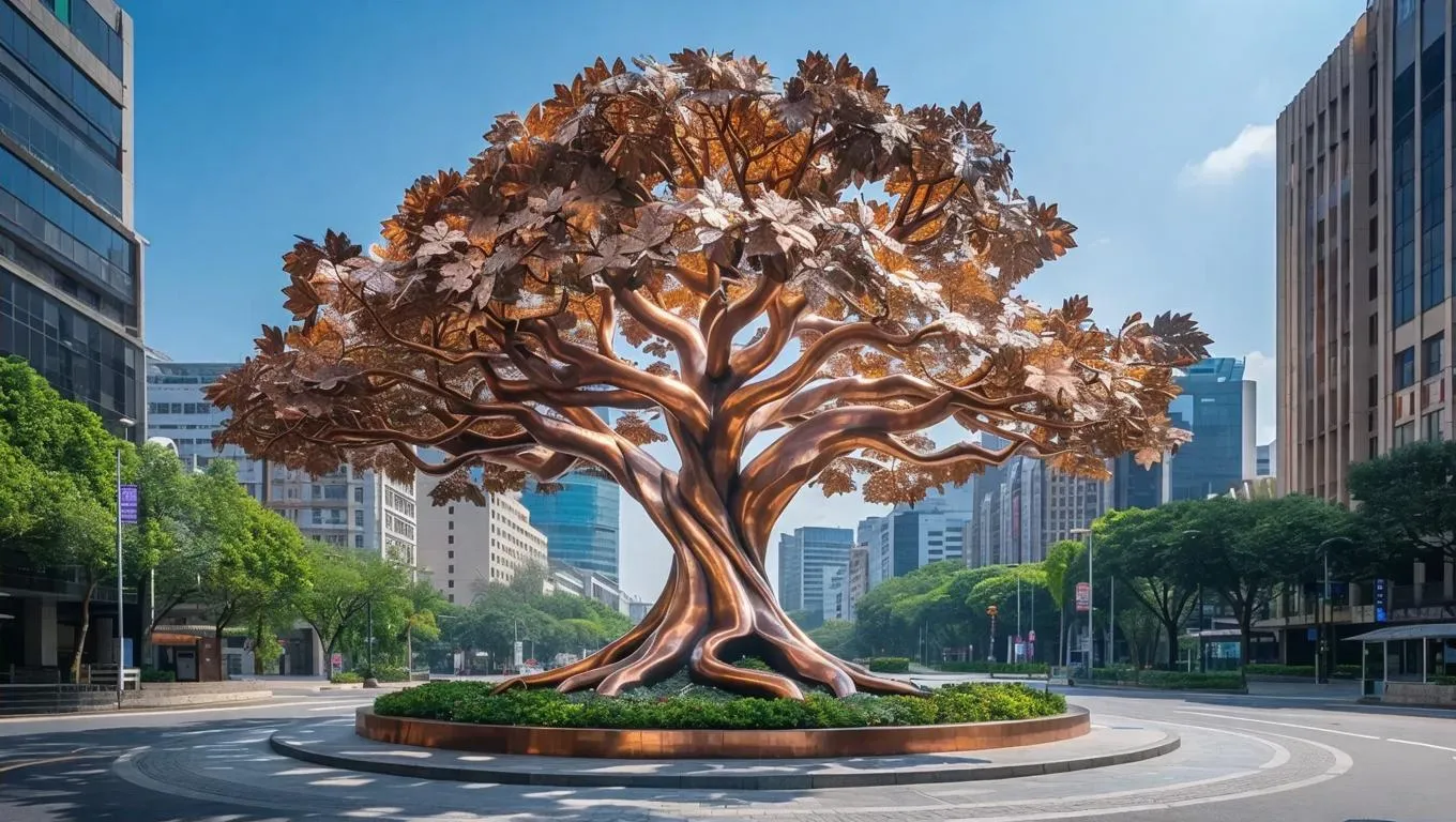 Create a stunning AI-generated copper tree statue for street roundabouts, blending metallic artistry with urban landscapes. Enhance public spaces with futuristic, lifelike sculptures using Vivago.ai's advanced image generation tools. Perfect for city planners, artists, or decorators seeking unique, eye-catching roundabout installations.