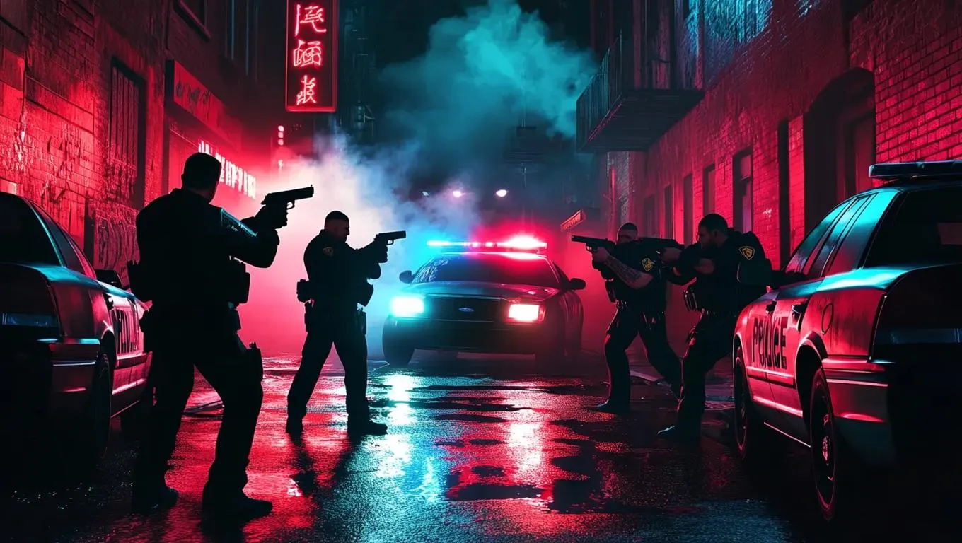 AI-generated cinematic noir scene: Tense standoff between tattooed gangsters in dark suits and tactical police in a neon-lit urban alley. Wet pavement reflects flashing patrol car lights as smoke heightens drama. Capture gritty atmosphere with AI-powered tools for professional noir-style visuals, blending armed tension, detailed textures, and dynamic lighting in this immersive law enforcement vs criminal confrontation.