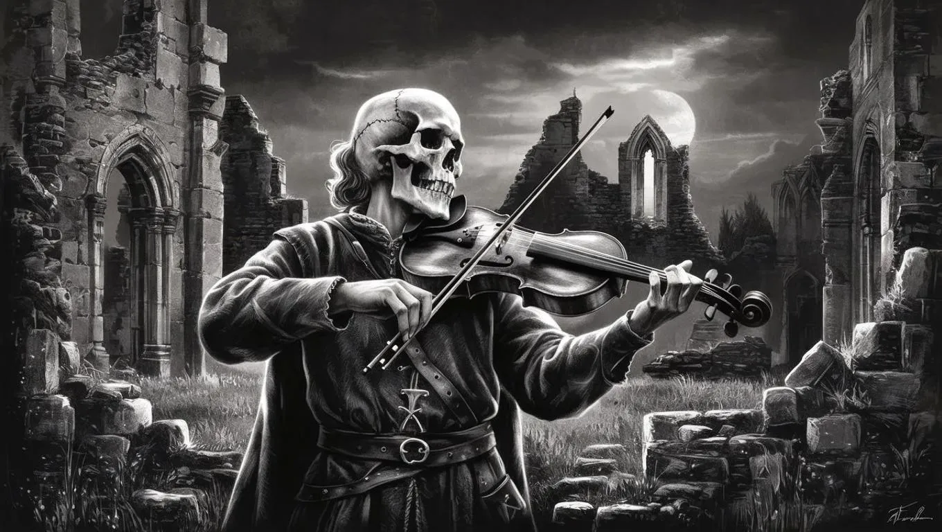 Create a striking medieval violin player with a haunting skull necklace, set against ancient ruins. This AI-generated black-and-white sketch combines gothic storytelling and historical artistry. Perfect for eerie, timeless visuals. Explore Vivago.ai's tools for monochromatic drama and AI-powered vintage effects.