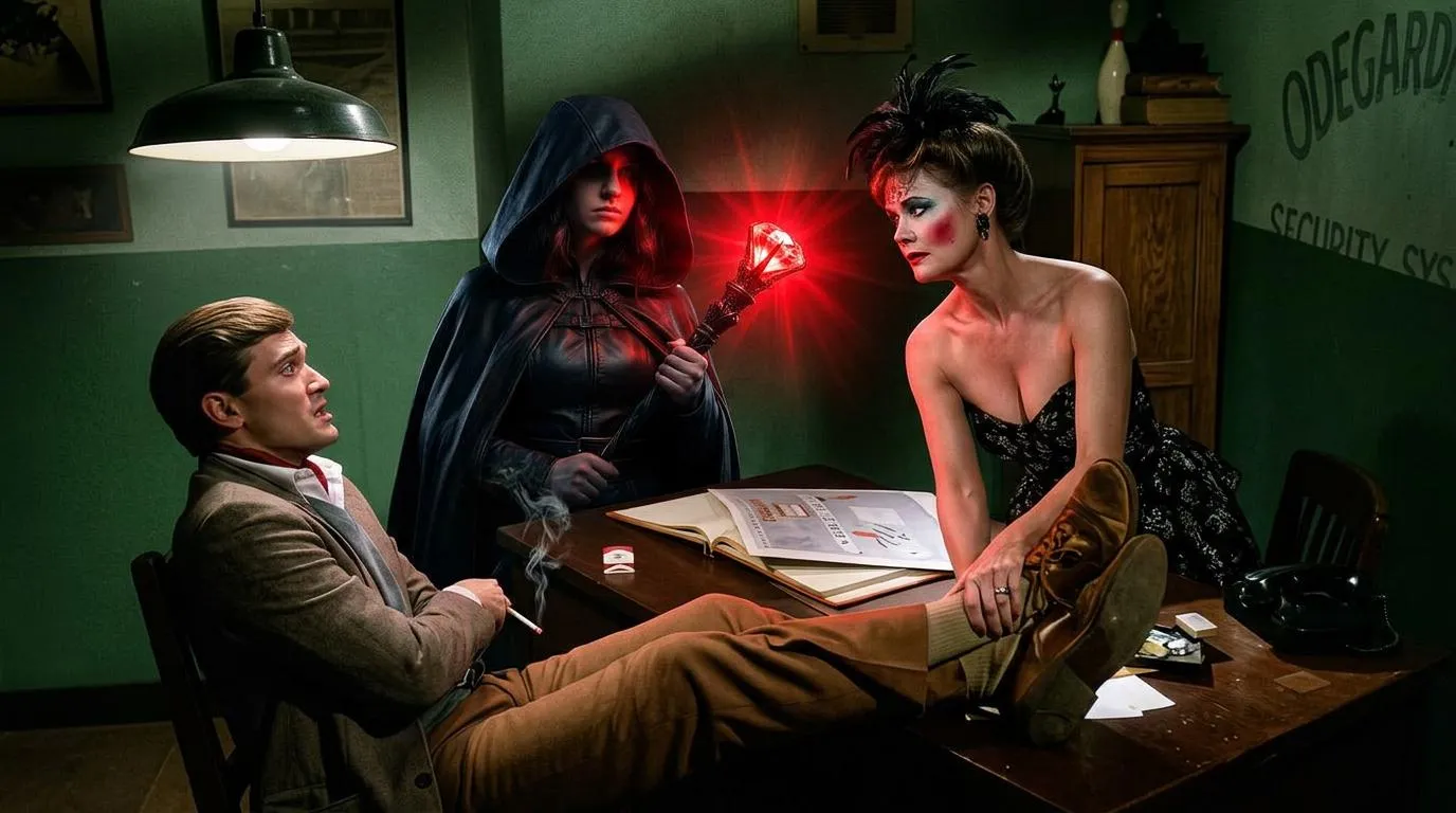 The witch girl with the another girl who she dancing beats the man who smoking and have his legs on the desk.Make the absolute revenge pic