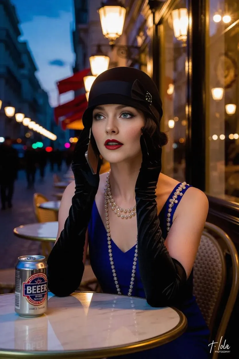 Generate sophisticated AI art of a 1920s flapper at a European cafe. She wears a black cloche hat, blue dress & pearls while using an iPhone, tin beer nearby. Art Deco style evokes vintage posters with golden light vs twilight blues. Create with Vivago.ai's AI art generator.