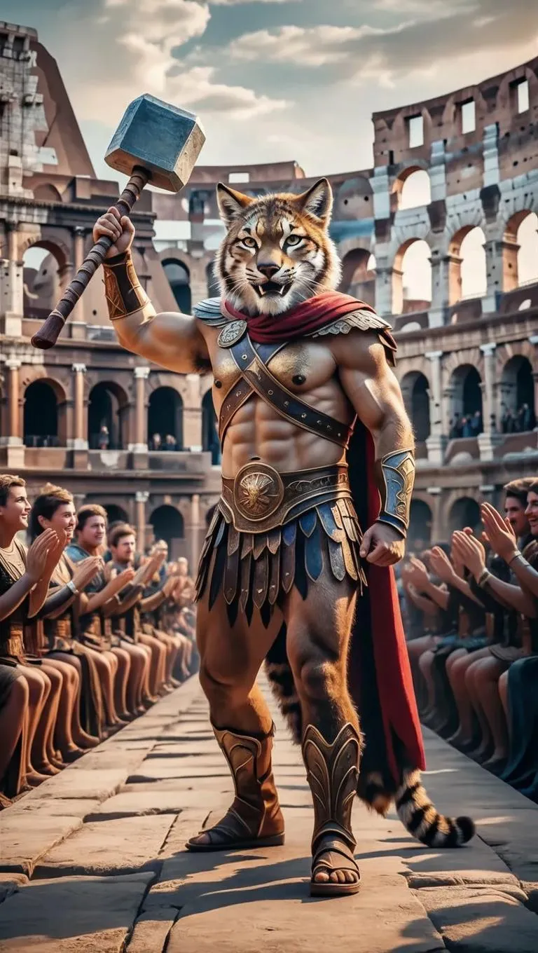 Create a cinematic 4K HD photo-realistic scene of a mythological wildcat-headed warrior wielding an ancient hammer, parading triumphantly on a Colosseum catwalk with an applauding audience. Elevate your visuals with Vivago.ai's AI image generator for professional-grade mythological art and dynamic storytelling effects.