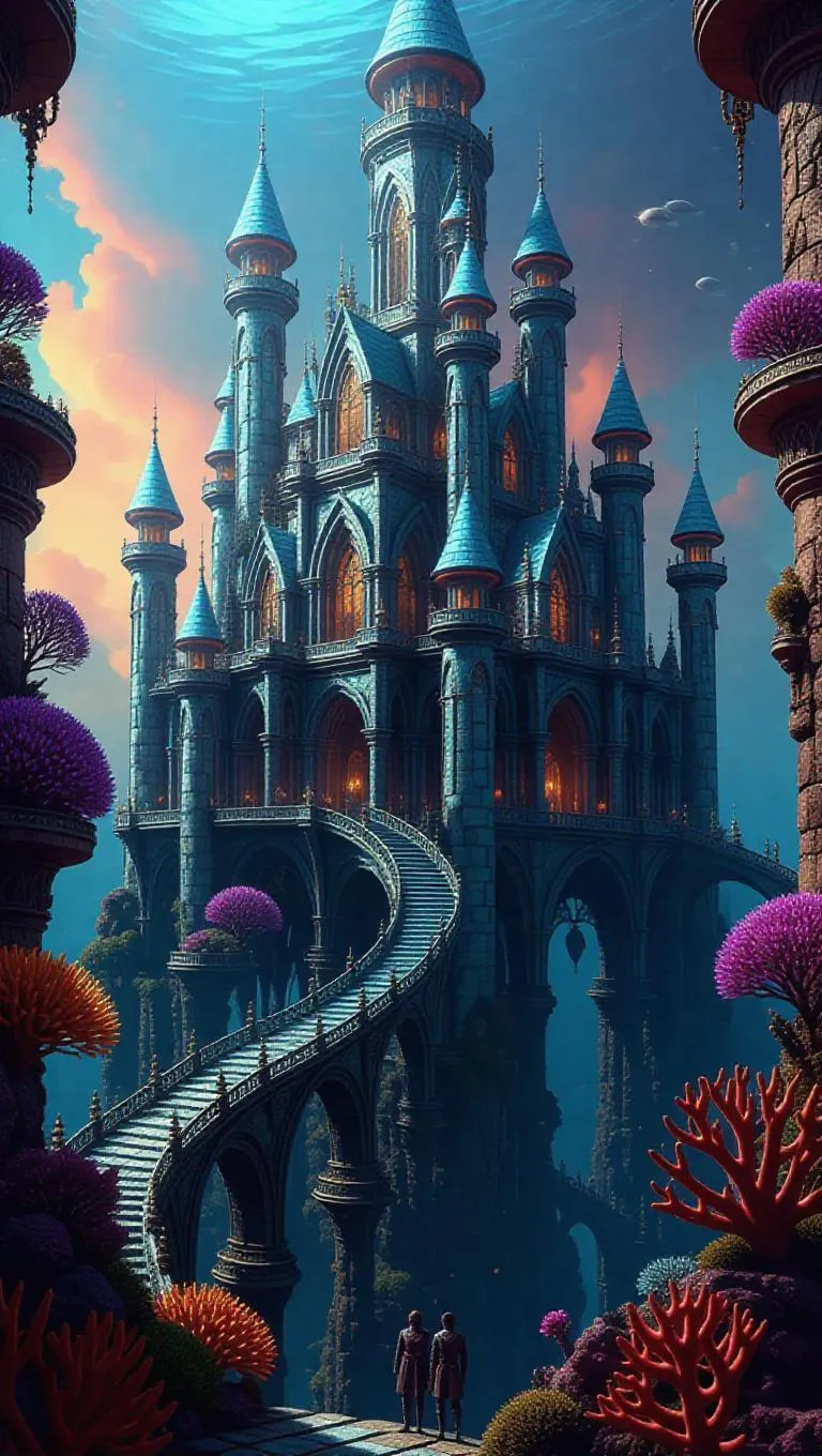 Castle of Celestia, the Celestian people, now inhabited by a strange new culture, the Crustacean Empire. Majestic towers adorned with luminescent shells, vibrant coral pathways, and bioluminescent flora. Celestian citizens mingle with crab-like rulers, creating a surreal blend of fantasy and underwater elegance.