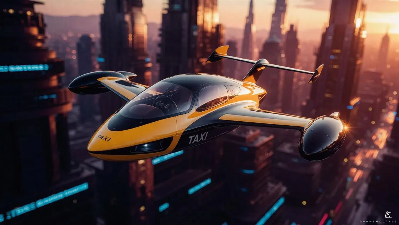 A futuristic flying car taxi soaring through the sky, with a bird's-eye view perspective. The car is sleek and aerodynamic, painted in a vibrant yellow and black color scheme, with the word 'TAXI' emblazoned on its side. It is set against a backdrop of a bustling, high-tech cityscape at sunset, with tall skyscrapers and neon lights. The lighting is warm and cinematic, casting long shadows and creating a sense of speed and movement. The scene has a cyberpunk art style, with a mix of modern and retro-futuristic elements.