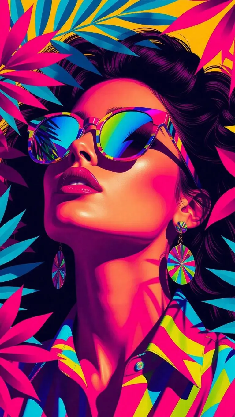 Discover bold AI-generated fashion visuals with iridescent sunglasses, earrings, and floral abstract compositions. Vivago.ai crafts vibrant vector art in daylight, blending sensual aesthetics and avant-garde style for professional-grade creative projects using advanced AI tools.