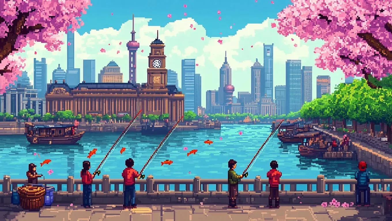 Generate a vibrant Stardew Valley-style 2D pixel art scene of Shanghai's Bund in spring. AI transforms prompts into detailed riverside serenity — cherry blossoms, fishing characters, leaping fish, and historic European-inspired architecture. Customize this nostalgic pixel world blending urban landmarks with soft sunlight, rippling water, and floating sakura petals using AI-powered creative tools.
