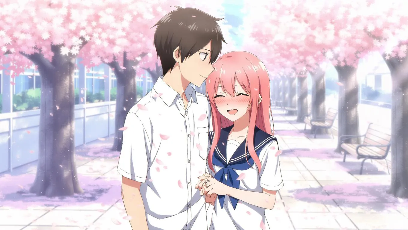 Create dreamy anime romance with vivago.ai's AI tools. Generate a sunlit high school courtyard scene with cherry blossoms, shy teens in uniforms, soft lighting, and pastel hues for a nostalgic, youthful spring vibe. Perfect for capturing tender young love and whimsical storytelling through AI-powered visuals.