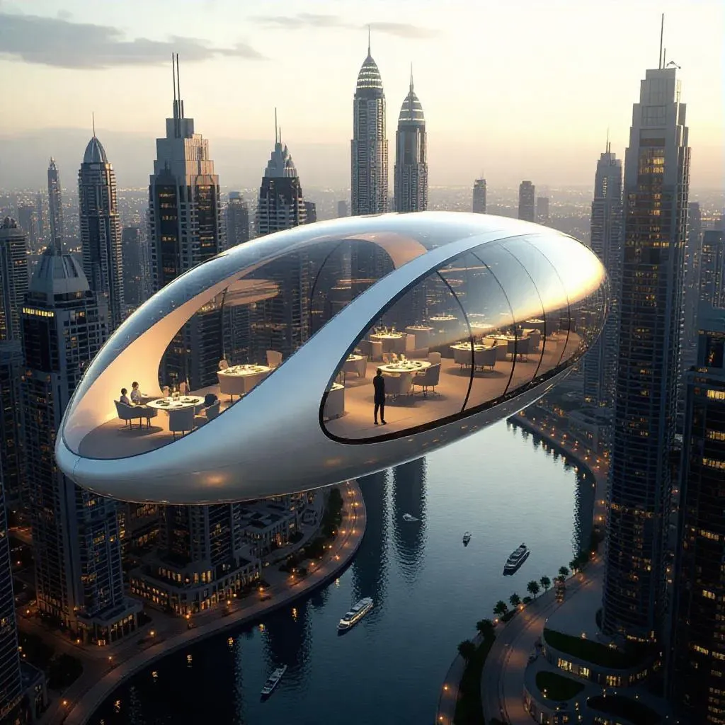 Generate stunning AI-powered sci-fi visuals of a futuristic silver-white aircraft with panoramic cabin hovering above a metropolis. Features multi-level lounge with warm lighting, passengers in elegant settings, and futuristic cityscapes blending skyscrapers, canals, and glowing vehicles. Ideal for creating sleek, atmospheric AI-generated future city scenes and sophisticated transport designs.