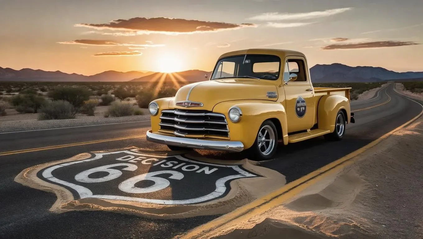 Generate a vintage 1954 yellow Ford truck cruising Route 66 with AI Sand Painting effects, blending retro Americana aesthetics and propaganda poster stylization. Create nostalgic, textured visuals through Vivago.ai's AI image tools for bold, professional-grade results inspired by mid-century design and iconic roadside adventures.