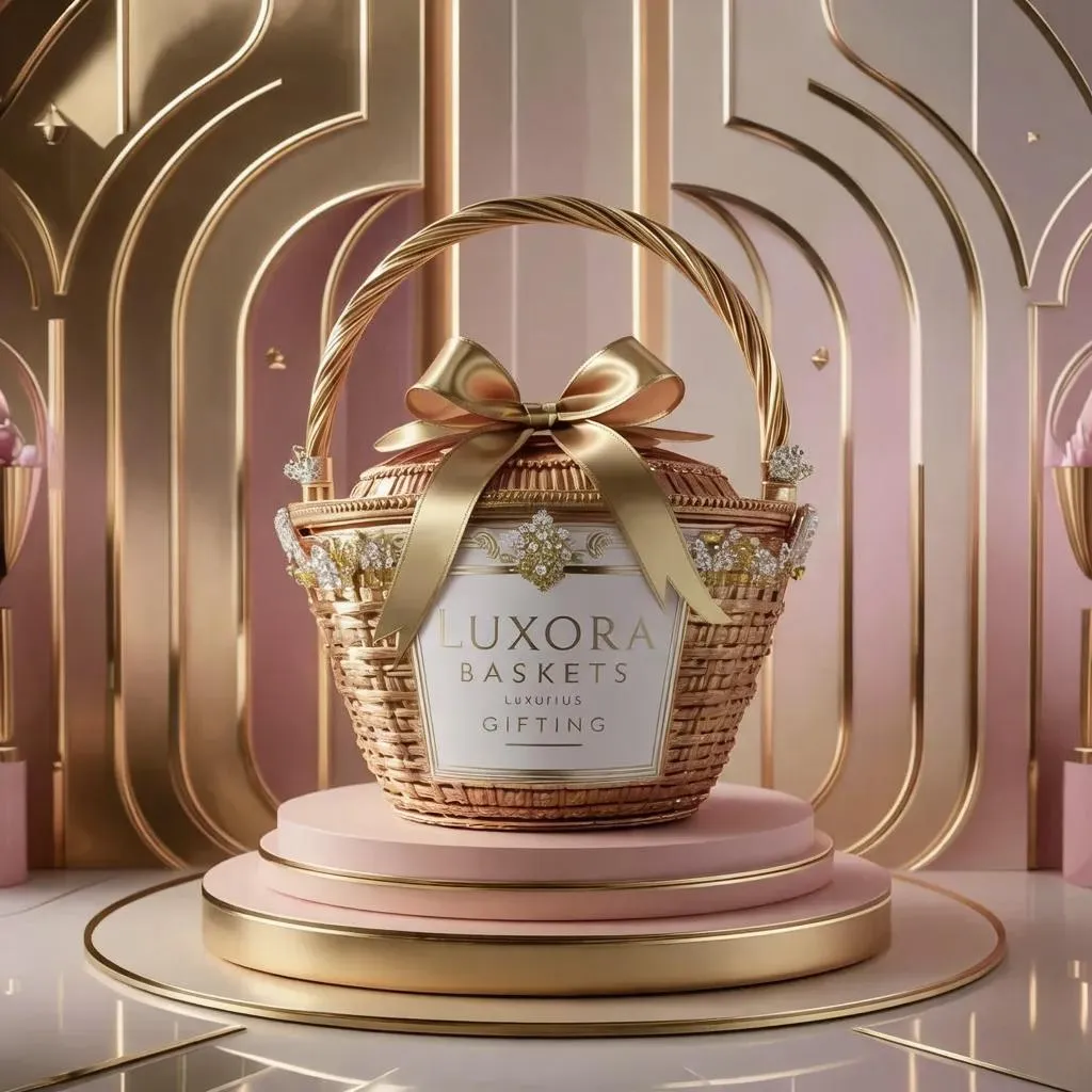 Craft a luxurious Luxora Baskets logo with AI precision. Featuring pastel hues, intricate basket details, and an elegant ribbon slogan "Luxurious Gifting". Exude sophistication and exclusivity, embodying high-end gifting excellence. Perfectly tailored to elevate your premium brand identity with opulent, AI-generated elegance.