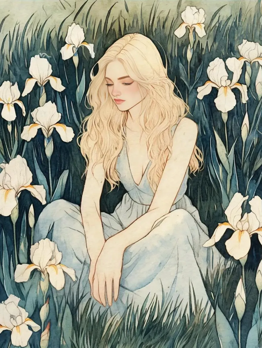 Create a stunning AI-generated watercolor and ink illustration of a blonde woman surrounded by blooming irises, lilies, and tulips. Featuring intricate textures, soft lighting, and ArtStation-quality details, this vivago.ai design transforms prompts into professional-grade digital art with trending aesthetic appeal.