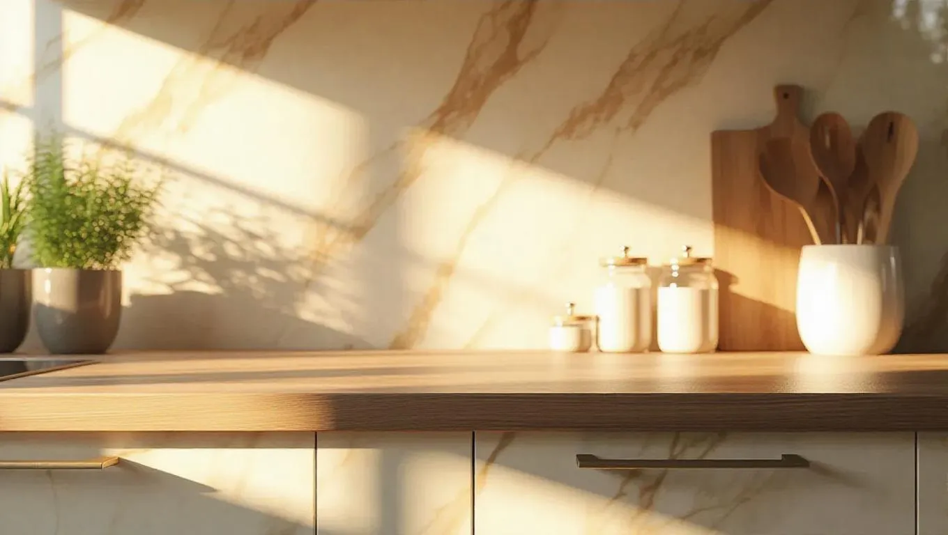 A cozy modern kitchen background with a natural wooden countertop, subtle marble or ceramic backsplash, and warm daylight streaming in from the side. Soft highlights and shadows across the surfaces. Neutral earthy color tones — light oak, beige, and off-white. No objects, no faucet — clean, empty space in the center. Shallow depth of field for background blur. Photorealistic, warm and inviting mood. 4K resolution, commercial product placement style.
