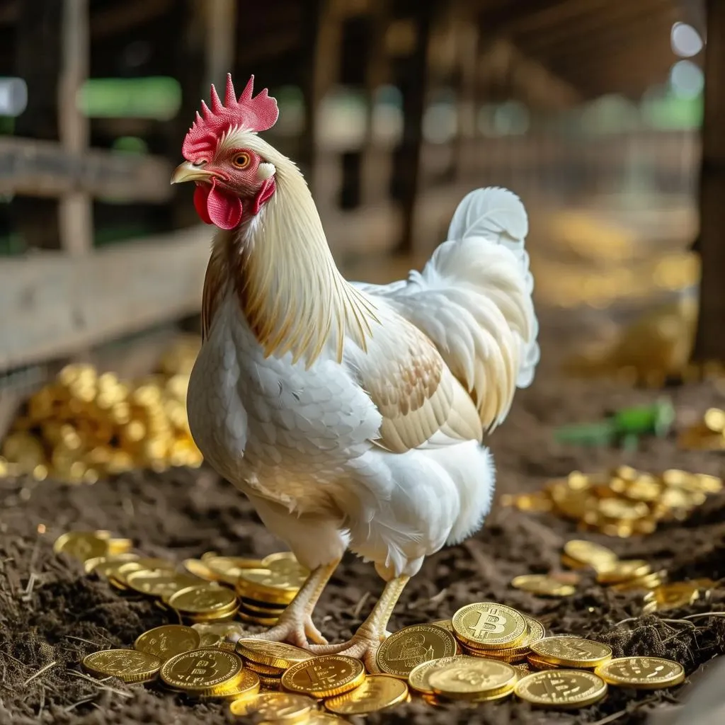 Create a whimsical farm scene with vivago.ai's AI image generator: a white chicken producing golden coin-shaped feces. Transform text prompts into professional visuals using advanced AI effects and editing tools. Perfect for blending humor and creativity in unique, high-quality content.