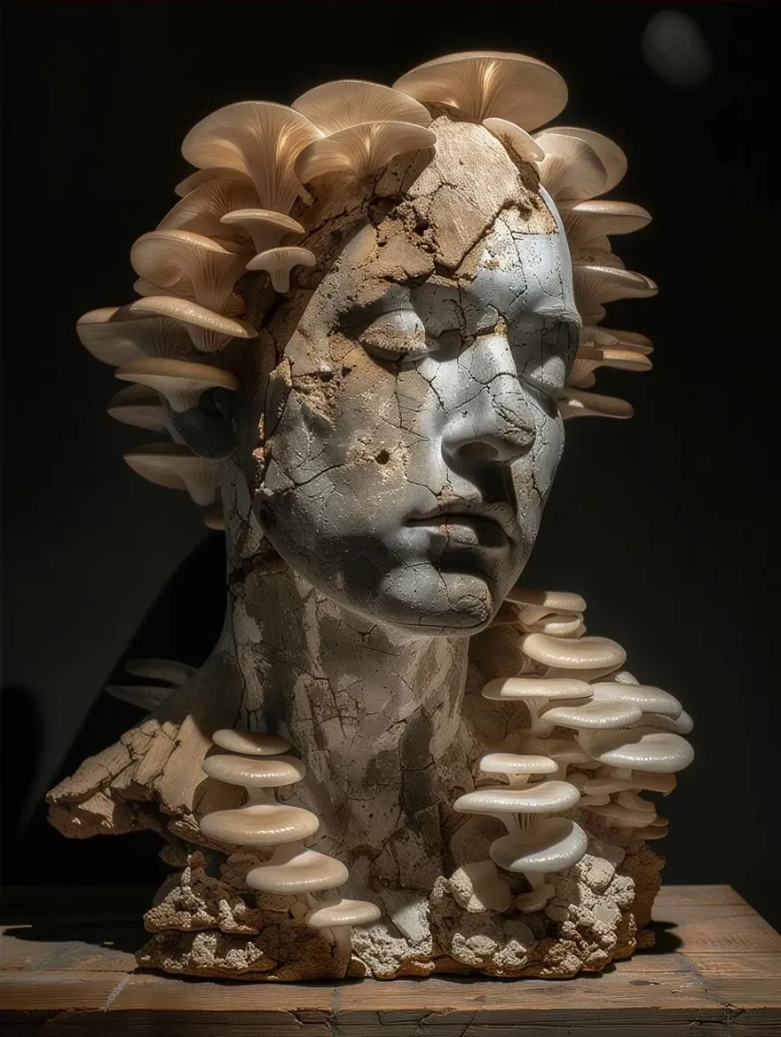 A hauntingly beautiful bioart installation blending contemporary sculpture with organic life: a weathered humanoid bust, sculpted from porous stone and reclaimed wood, serves as a living canvas for clusters of oyster mushrooms. The fungi emerge from cracks and crevices—soft, pearly caps unfolding against the coarse texture of the sculpture, symbolizing decay and rebirth. Ambient lighting highlights the contrast between the lifeless material and the growing organisms. The composition evokes themes of impermanence, nature reclaiming form, and the fragile intersection of the artificial and the biological. Museum-grade, hyper-detailed, with an earthy, surreal aesthetic.