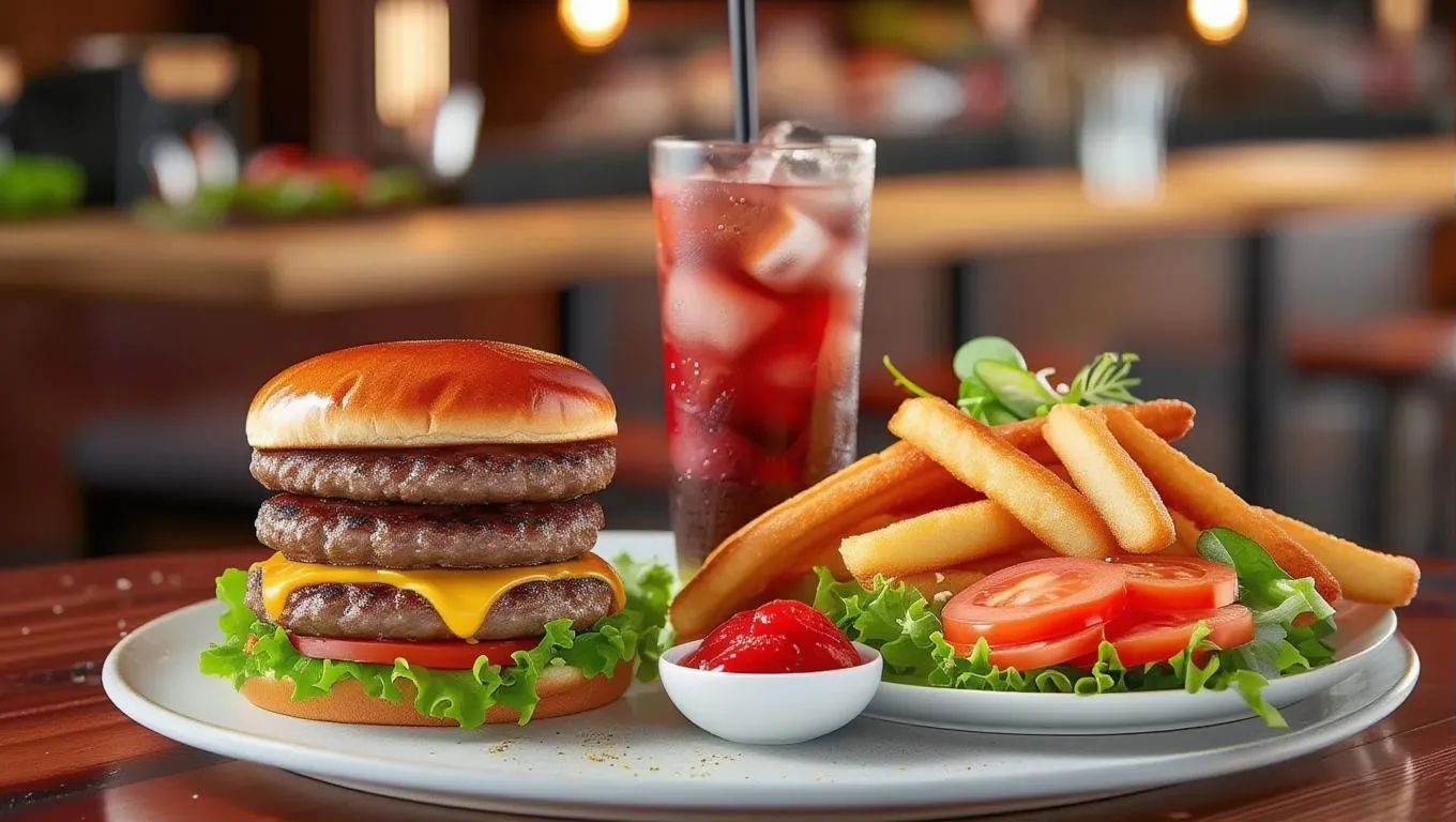 Generate mouthwatering burger meal visuals with AI. Create vibrant, detailed images of juicy burgers, crispy fries, and soda drinks arranged on a table using vivago.ai's text-to-image tools. Perfect for fast-food photography, menu design, or advertising content. Elevate your food presentation with lifelike AI-generated burger sets in professional quality.