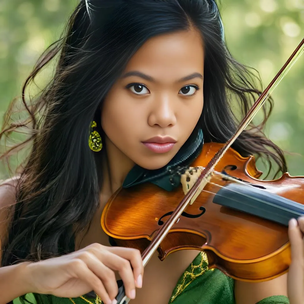 Ultra-detailed 717-gigapixel AI-generated image of a violinist with striking green eyes, flowing dark hair, and precise bow coordination. Soft-blurred background emphasizes emotional live performance dynamics. Explore AI animation tools for lifelike musical expressions, fingerboard dexterity, and rhythmic motion capture. Perfect for creators seeking professional-grade visual storytelling in music and artistry.