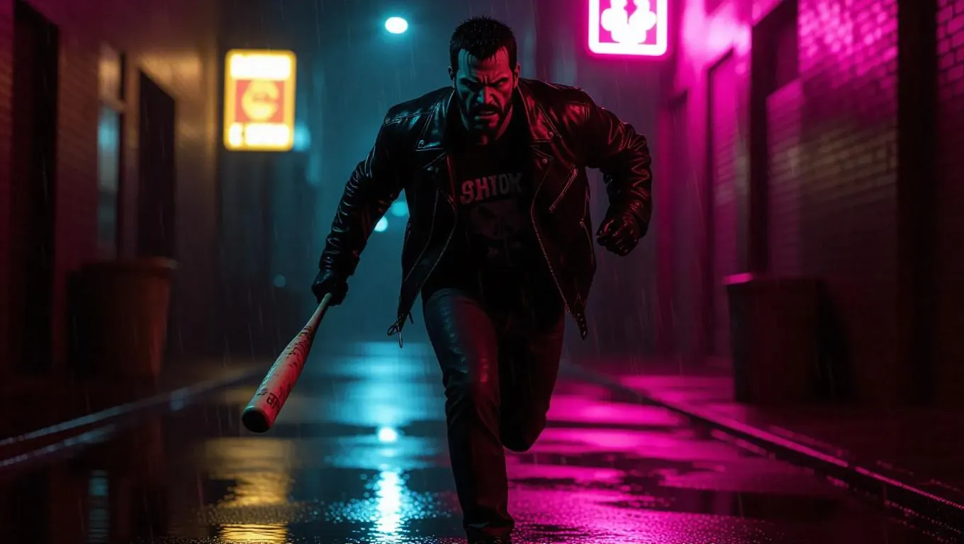 A menacing thug, wielding a worn baseball bat and sporting a black leather jacket, is swaggering down a dimly lit alleyway, rain pouring down around him, reflecting off the wet pavement and neon signs of nearby city streets, the flickering glow of a lone streetlamp casting long shadows behind, as he's running with a reckless abandon, bat at the ready, amidst a gritty, cinematic GTA-style urban landscape.