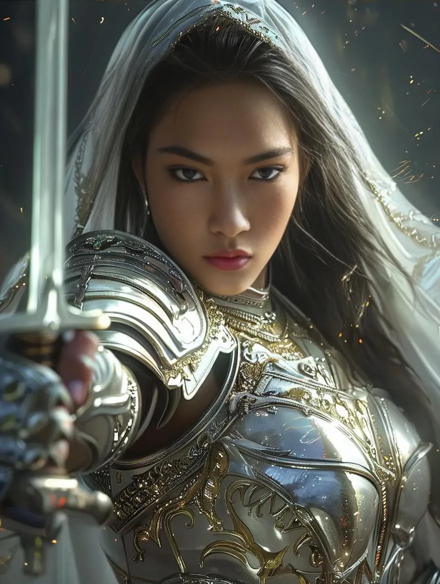Create a stunning AI-generated image of a heroic Filipina warrior in glistening Armor of Light, battling darkness with a radiant sword. Blending epic fantasy, romantic elegance, and futuristic hyperrealism, this vivago.ai art captures divine strength and modesty, transforming text into vivid, symbolic visuals for professional-grade creative projects.