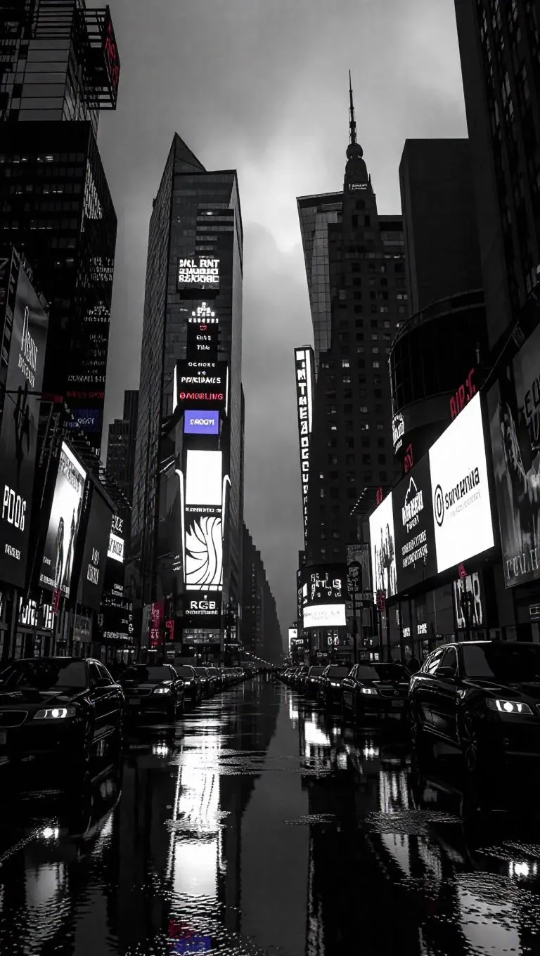 Black and white photograph of a futuristic cityscape at night, tall buildings and skyscrapers lit with neon signs and advertisements, dark and cloudy sky, wet ground from recent rain, busy street with parked cars and pedestrians, eerie and futuristic atmosphere.