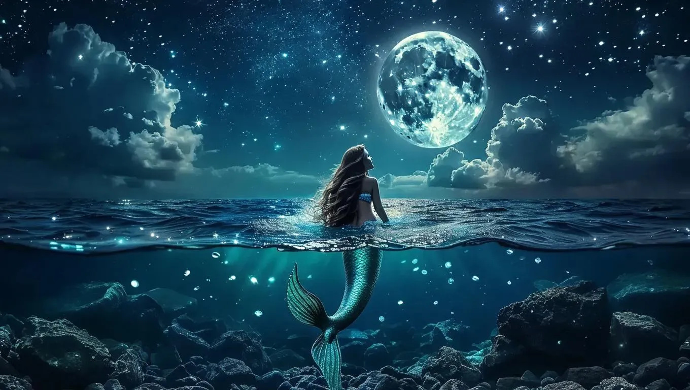 Create a mystical dark mermaid scene with vivago.ai's AI image generator. Transform text into eerie underwater visuals: starry skies, jeweled black rocks, and a faint moonlit night. Craft professional-grade fantasy art with AI effects for hauntingly beautiful, celestial-inspired oceanic imagery.