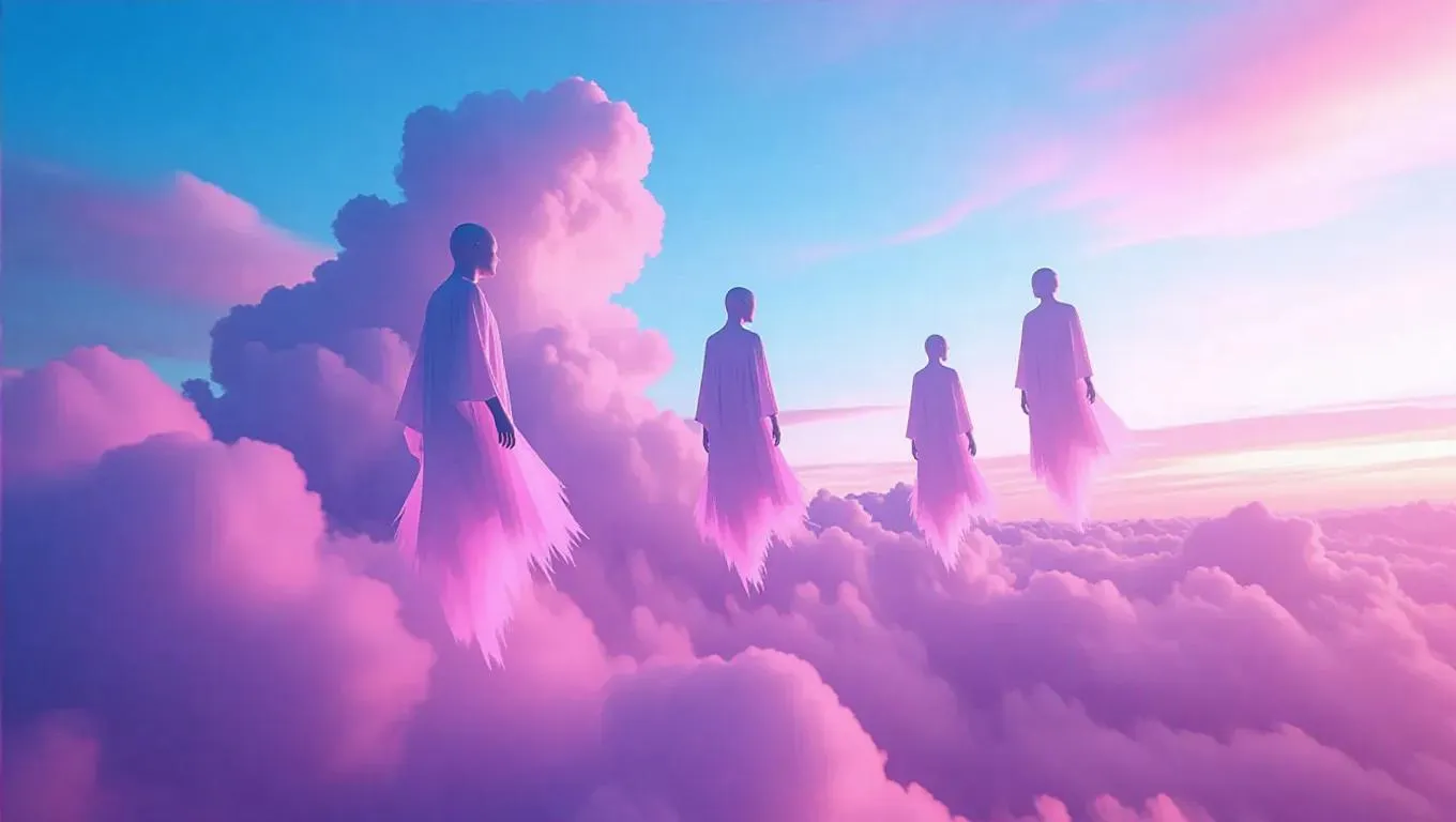 Dreamlike figures suspended amidst wispy cirrus clouds, their bodies morphing into fantastical creatures, drifting lazily, defying gravity, against a backdrop of iridescent, shimmering cloud formations, delicate, feathery tendrils curling, evoking an otherworldly, eerie atmosphere, hyper-realistic, cinematic extreme wide shot, ethereal, soft pastel hues, bold, vivid colors bursting, Salvador Dali-inspired, unsettling, fantastical.