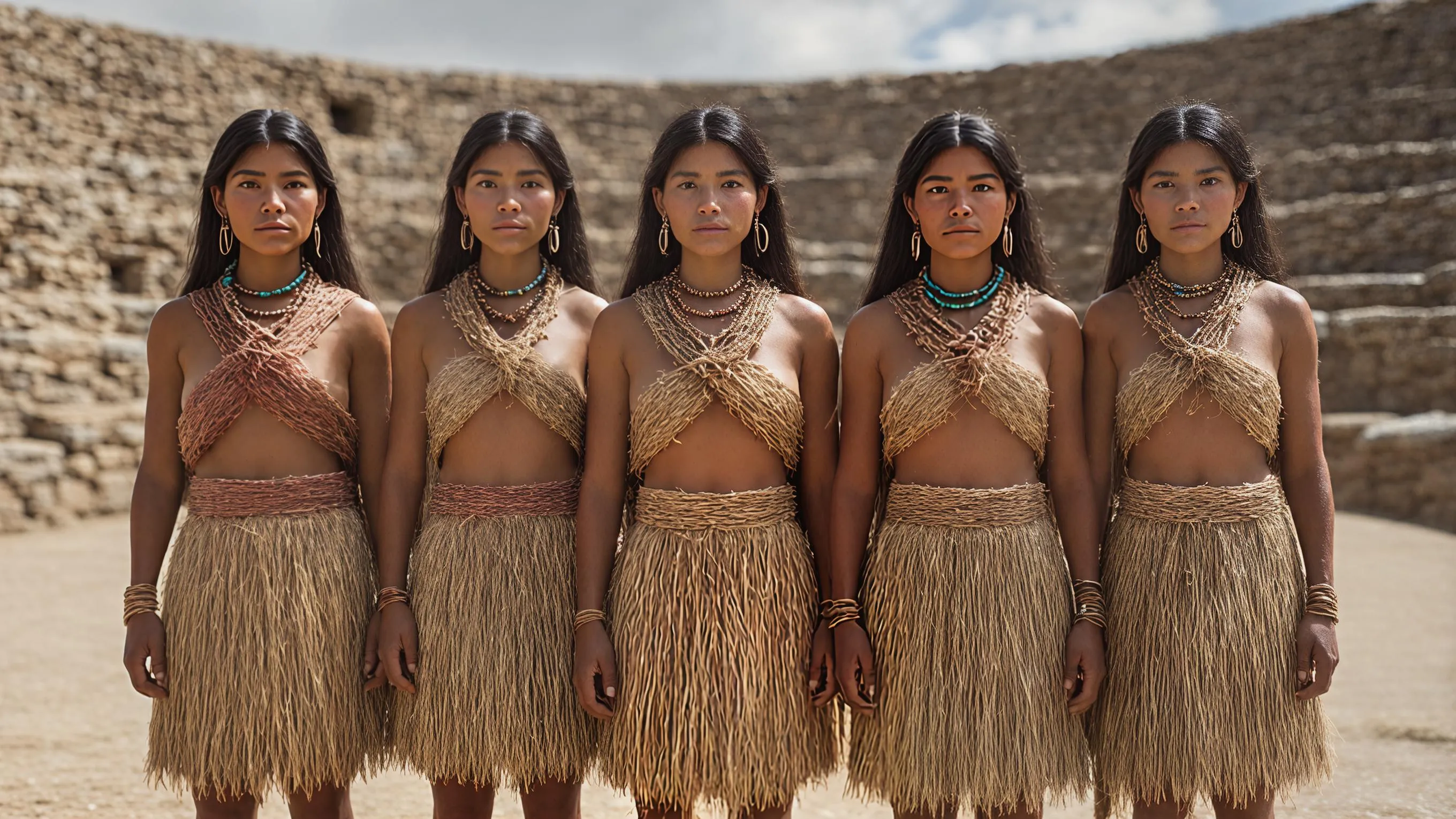 Ultra-photorealistic 8K still image of five identical Caral-Supe women from Sacred City of Caral, Peru (Late Archaic Period, 3000–1800 BCE peak), standing in perfect straight line formation facing viewer at edge of main sunken circular plaza, authentic Norte Chico features (copper-brown skin, straight black hair, prominent cheekbones, sturdy Andean builds, dark expressive eyes). Stable, archaeologically accurate organic-fiber clothing (NO ceramics/weaving evidence): Simple woven reed/grass skirts to knees in natural tones (beige reeds, reddish-brown llama fiber) Minimal upper body wraps (llama wool bands across chest) or topless with reed shawls Quipu cords draped over shoulders (knotted counting strings – Caral signature find) Stone/wood beads (cotton seeds, quartz, shell), llama bone hairpins, turquoise ear spools NO metal, NO ceramics, NO colorful dyes – natural materials only Precise group positioning (left to right): Tallest: reed skirt + red llama band, largest quipu cords + stone necklace Medium: brown grass skirt + beige shawl, bone hairpins both sides Center: beige reed skirt + double quipu strands + shell necklace Medium: red skirt + brown shawl, single large turquoise ear spool Shortest: natural reed skirt + llama band, prominent bone hairpin FOREGROUND – Authentic Caral-Supe archaeological objects: 15+ quipu bundles (multi-colored knotted cords on reed frames) Reed flutes (18 bone/wood flutes excavated), whistling water vessels Cotton boll piles (domesticated plants), llama bone tools, obsidian blades Shicra bags (bundled reeds filled with stones for pyramid construction) DETAILED LIVELY BACKGROUND (50+ Caral-Supe people around Plaza Mayor): 15 MEN: copper-brown skin, short hair, reed skirts + shawls, hauling shicra bags (20kg stone-filled reed bundles), carrying llama offerings, arranging quipu records 25 WOMEN: long straight hair, grass skirts + minimal wraps, grinding cotton seeds on stone manos/metates, weaving reed baskets, filling gourd water vessels 12 CHILDREN (small reed cloths): playing w/ cotton boll toys, mini quipu cords, reed whistles Musicians blowing bone flutes, construction workers stacking shicra bags PHOTOREALISTIC SETTING – Caral Sacred City (intact peak period): Golden hour over Plaza Mayor (sunken circular plaza, 100m diameter), surrounded by six earthen platform pyramids (Pirámide Mayor 18m high, stone-faced) Dry desert terrace overlooking green Supe river valley (irrigated cotton/squash fields) Circular stone amphitheaters, reed-thatched elite residences, llama corrals NO ceramics, NO metal tools, NO defensive walls – peaceful ceremonial city Ultra-photorealistic details: Natural skin texture (sunburn, windburn), reed weave texture, llama wool fuzz Depth of field: sharp foreground women/objects, detailed populated background Harsh coastal desert lighting w/ long shadows, dust haze from construction