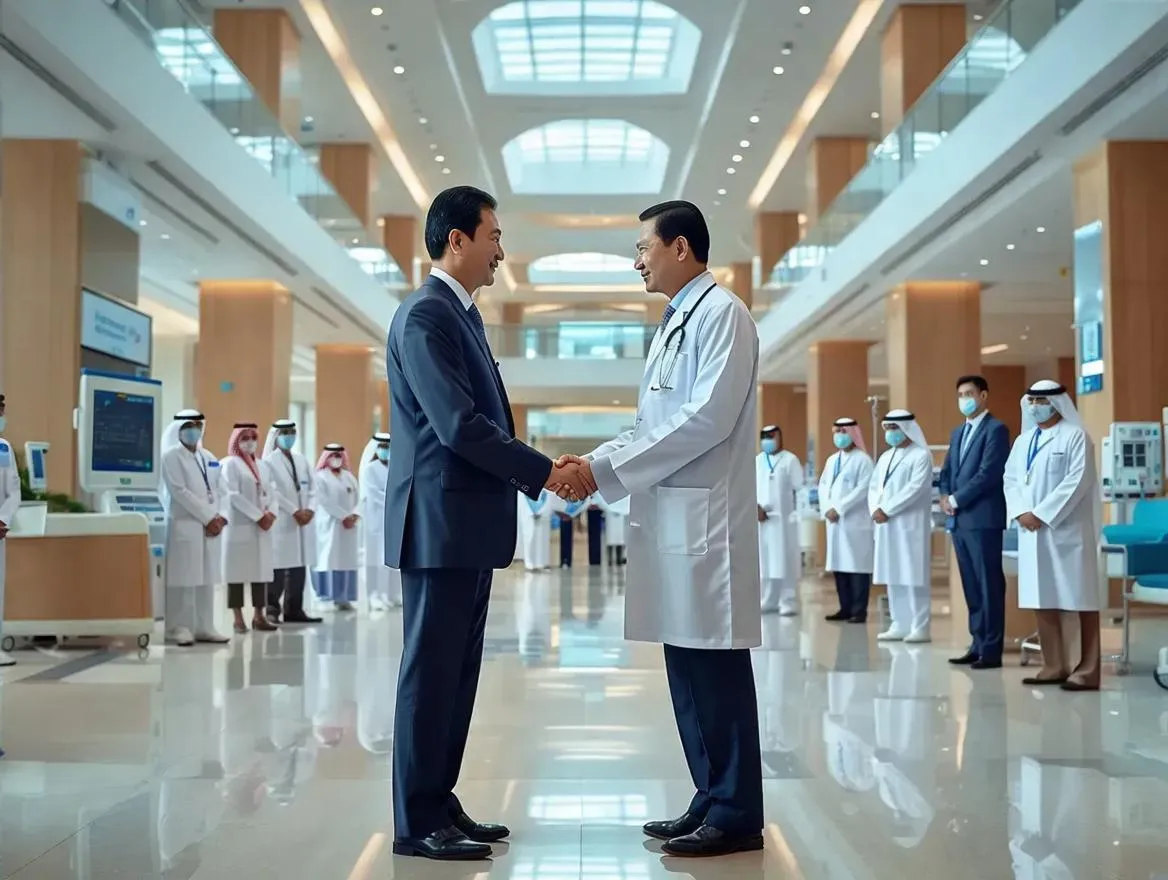 Capture the essence of formal collaboration with AI-generated imagery of a cooperation ceremony. Showcase a professional in a suit shaking hands with a hospital representative, symbolizing business-medical partnerships. Ideal for creating high-quality visuals for alliances, sponsorships, or event promotions. Elevate your brand's narrative with precision-crafted, professional-grade AI visuals by VivaGo.