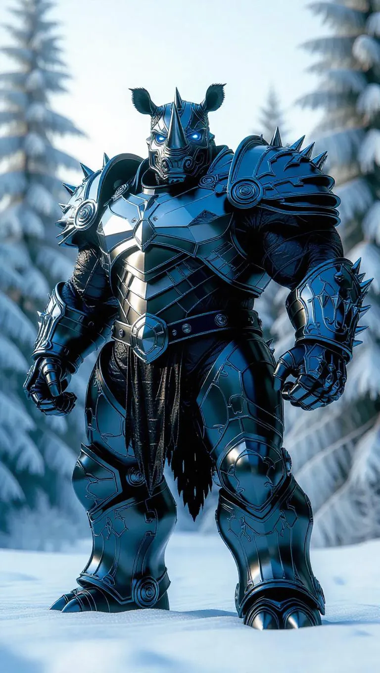 Generate a futuristic cybernetic rhino warrior with icy-blue chrome armor in a snowy wasteland using AI. Create steampunk mecha-beast visuals, surreal digital effects, and hyper-realistic winter scene rendering for next-gen character design and sci-fi worldbuilding.