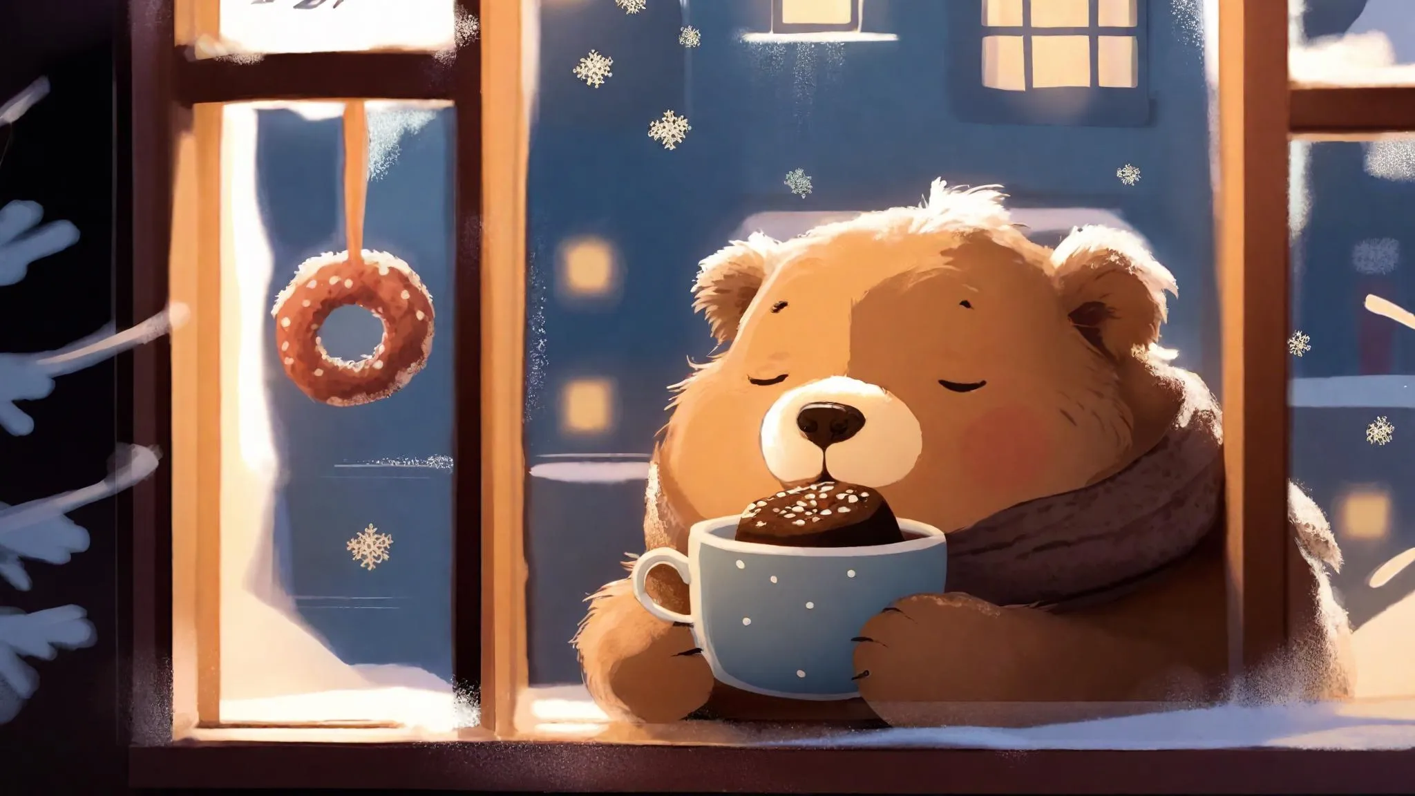 Create a serene AI-generated winter scene with a chubby, fluffy brown dog by a frosty window. Featuring a steaming teacup, whimsical doughnut crown, and lofi-inspired red-blue hues, this cozy image blends tranquil vibes with playful charm. Perfect for evoking snowy evenings and heartwarming moments through AI artistry.