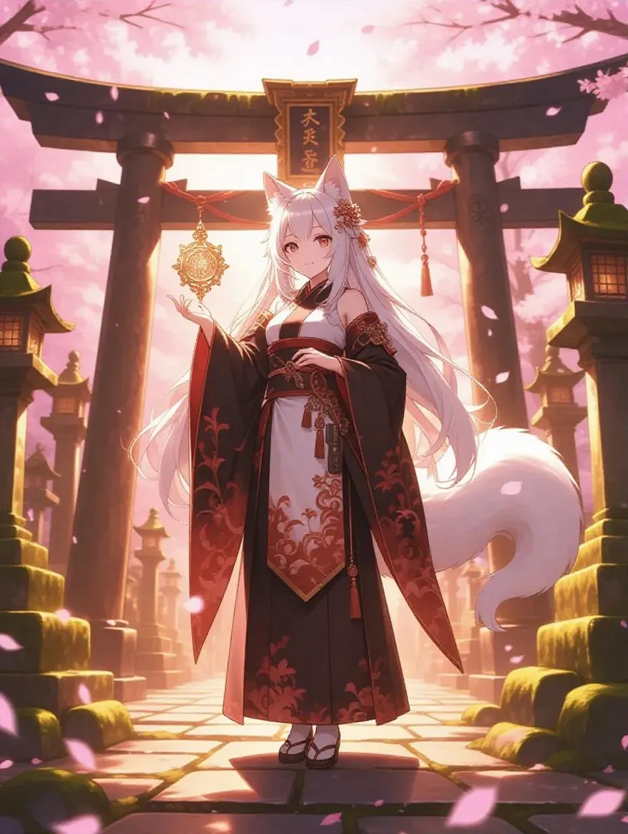 A vertical trading card illustration in anime style, featuring a gentle fox girl in shrine maiden robes with long white hair and soft brown eyes, standing confidently inside an ornate fantasy card frame. The frame is adorned with glowing flames, cherry blossoms, and golden ornaments. She holds a small spirit orb and stands in front of a Torii gate surrounded by moss and falling leaves. Her fluffy tail curls protectively, exuding earth-element vibes. The background glows with soft sparkles, and the card has a magical, high-detail look, designed for a game card.