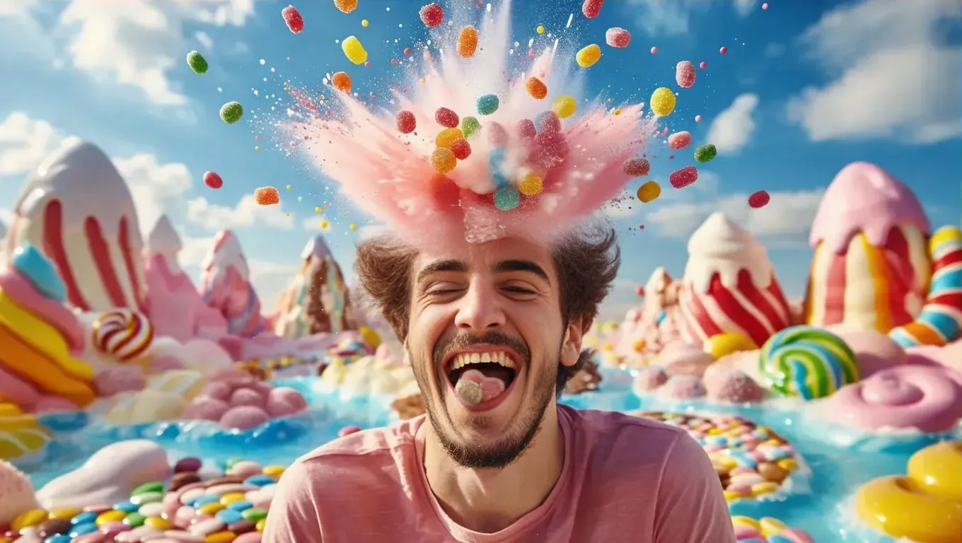 Experience the vibrant AI-generated visuals of a man savoring candy with an explosive burst of sensation. Dive into vivid colors, dynamic textures, and surreal effects that capture sensory overload. Perfect for creative projects, ads, or art—explore AI-powered image generation tools for striking, professional-grade results. Transform your ideas into eye-catching visuals with cutting-edge AI effects and color enhancement.