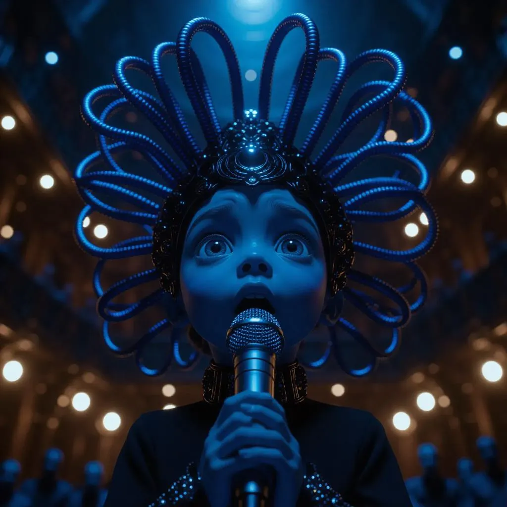 Experience a surreal AI-generated image of an intergalactic concert hall, featuring a blue-headed alien child with a intricate black headdress and writhing tubes. Captured in vivid lighting, the futuristic scene highlights dramatic details, emotive expressions, and a blurred audience backdrop. Create this sci-fi spectacle with Vivago.ai's advanced AI art tools for striking, professional-grade visuals.