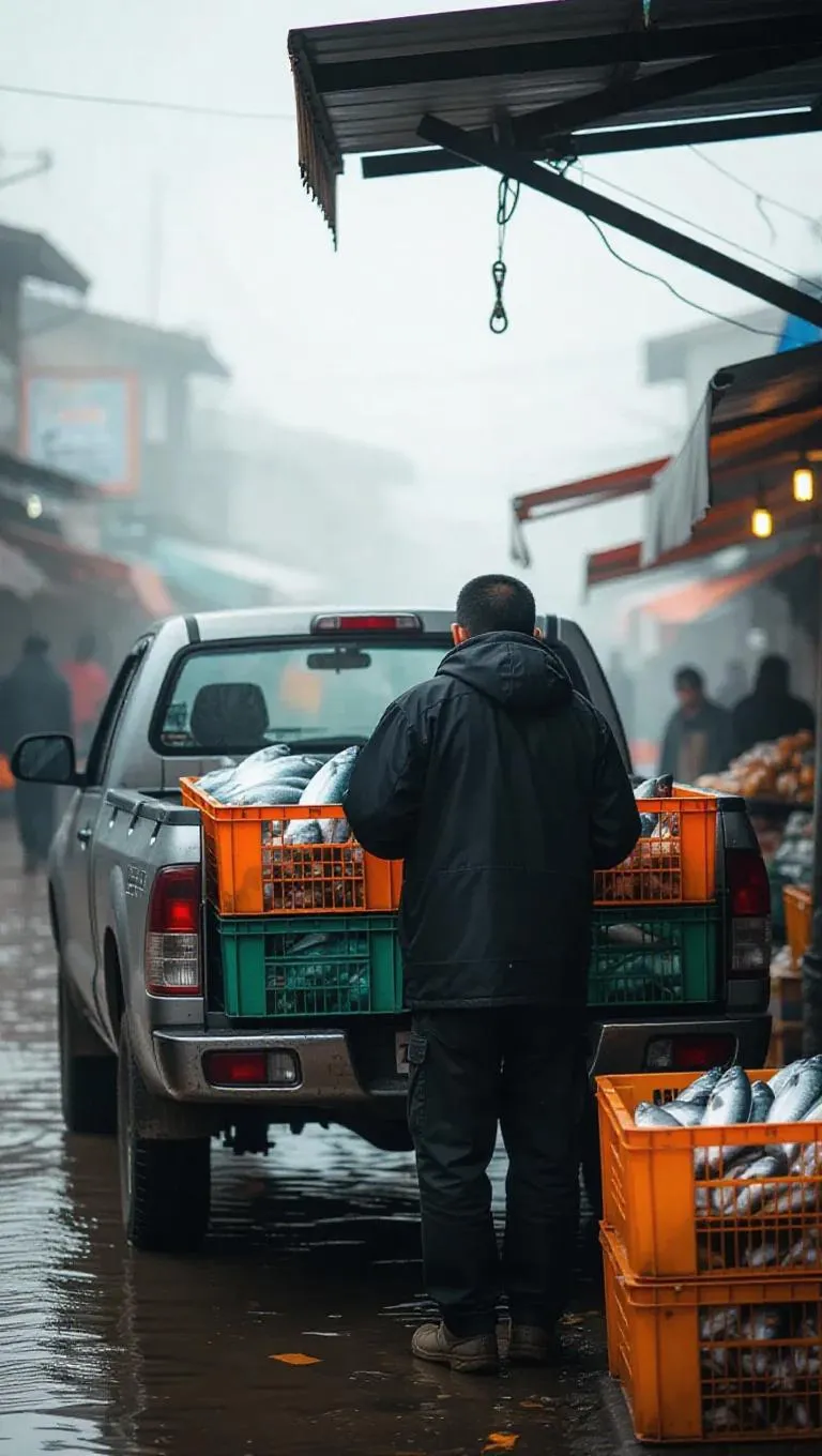 Generate realistic AI visuals of a small pickup truck delivering fresh fish to a coastal market. Young man unloading crates in foggy ambiance, vertical 9:16 format. Perfect for seafood logistics, market scenes, or AI-generated photorealistic transportation imagery with vivago.ai's professional editing tools.