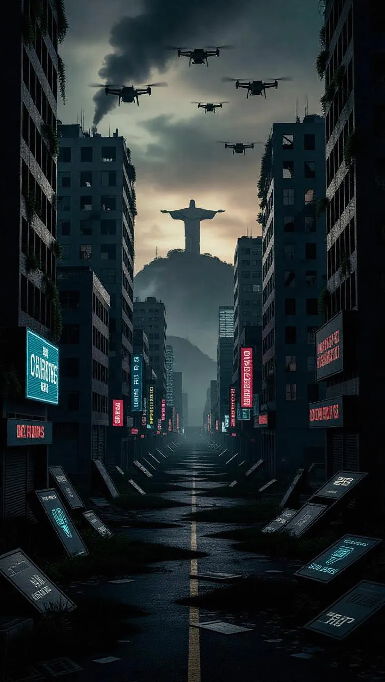 Explore a dystopian futuristic vision of Brazil with AI-generated visuals: ruined cities, collapsed skyscrapers, overgrown vegetation, neon-lit cyberpunk streets, drones, and damaged Cristo Redentor. Create dark, moody scenes blending advanced tech remnants and post-apocalyptic decay using Vivago.ai's AI image tools for striking, professional-grade dystopian art.
