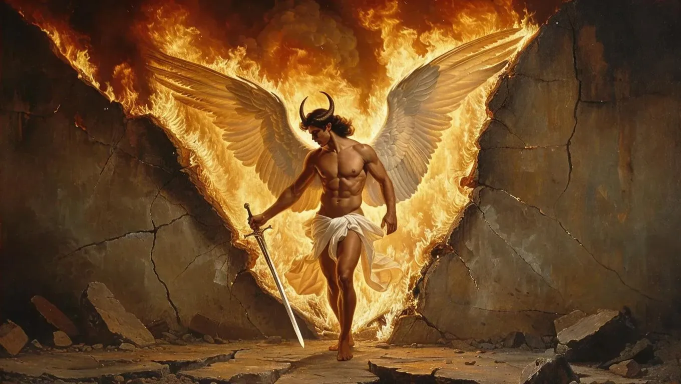 Create AI-generated visuals of Lucifer inspired by Alexandre Cabanel's *The Fallen Angel*, emerging from fiery ground cracks with a blazing sword. Transform text prompts into dramatic infernal scenes using vivago.ai's AI effects for striking supernatural imagery, dynamic fire backdrops, and luminous weapon details in professional-grade digital art.