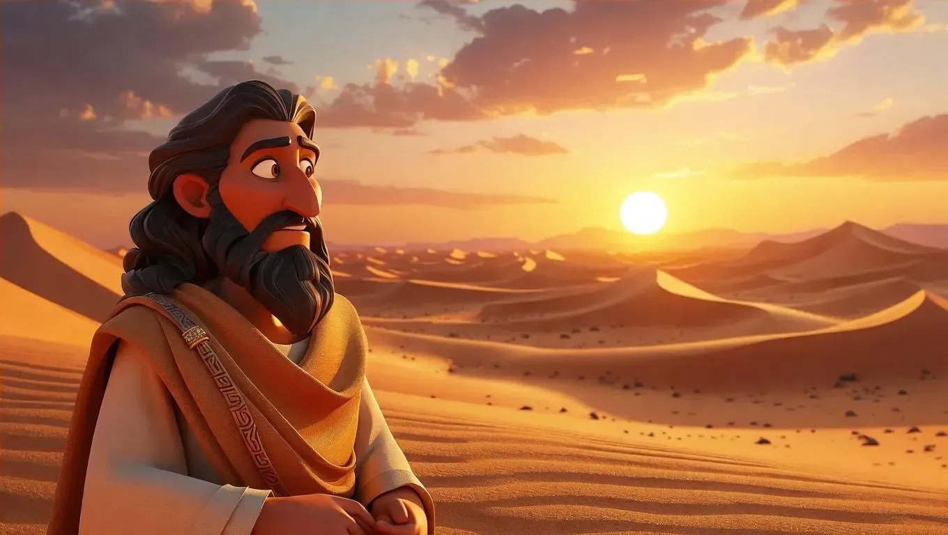 Generate a stunning 3D cartoon depiction of Moses in a desert sunset with Disney-Pixar charm. Vivago.ai transforms text prompts into vibrant, cinematic visuals using AI, blending Dune-inspired landscapes with playful animation styles for professional-grade, whimsical storytelling imagery.