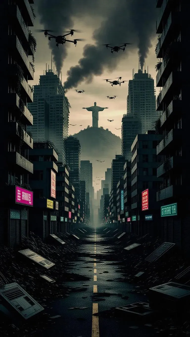 Explore a dystopian futuristic vision of Brazil with AI-generated visuals: ruined cities, collapsed skyscrapers, overgrown vegetation, neon-lit cyberpunk streets, drones, and damaged Cristo Redentor. Create dark, moody scenes blending advanced tech remnants and post-apocalyptic decay using Vivago.ai's AI image tools for striking, professional-grade dystopian art.