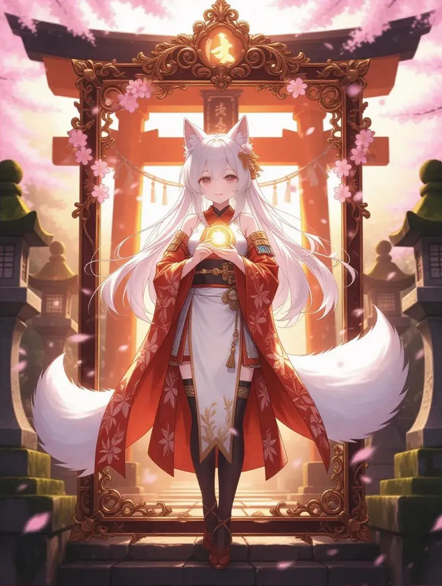 A vertical trading card illustration in anime style, featuring a gentle fox girl in shrine maiden robes with long white hair and soft brown eyes, standing confidently inside an ornate fantasy card frame. The frame is adorned with glowing flames, cherry blossoms, and golden ornaments. She holds a small spirit orb and stands in front of a Torii gate surrounded by moss and falling leaves. Her fluffy tail curls protectively, exuding earth-element vibes. The background glows with soft sparkles, and the card has a magical, high-detail look, designed for a game card.