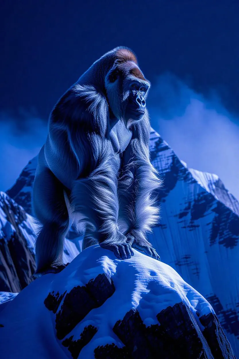 Generate a hyperrealistic white gorilla portrait in snowy mountain scenery with dreamlike National Geographic aesthetics. AI-powered tools blend Germanic art influences, Hollywood-grade visuals, and night photography effects for striking animal imagery. Elevate your creative projects with vivid coloristic details and emotive facial expressions using advanced AI image generation.
