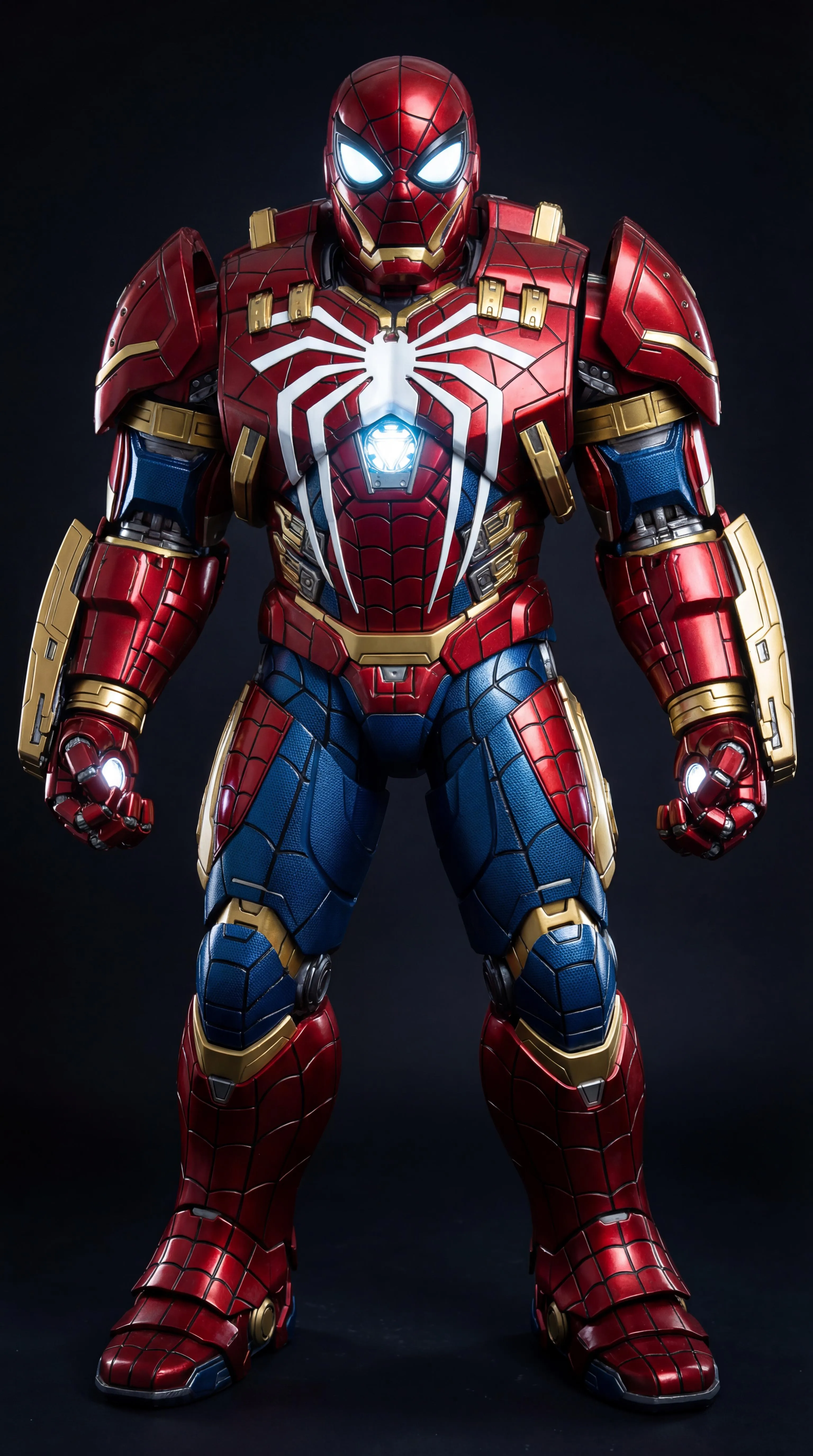 The Invincible Iron Man and the Insomniac Spider-Man (voiced by Yuri Lowenthal) combined together as Iron-Spider. In accordance with this fusion, the red portions on both characters' suits combine together and both combine and feature the web designs on Spider-Man's two suits as one, the blue parts on Spider-Man's two suits combine as one, the gold sections on Iron Man's two armors combine as one, the eye slits on Spider-Man's two suits combine with the lit-up eye slit-like features on the masks of Iron Man's two armors, the front spider logos on Spider-Man's two suits combine as one and feature the glowing chest pieces of Iron Man's two armors combined as one in the center, and the glowing palm-based repulsor nodes on Iron Man's two armors are combined as one on the gauntlets.