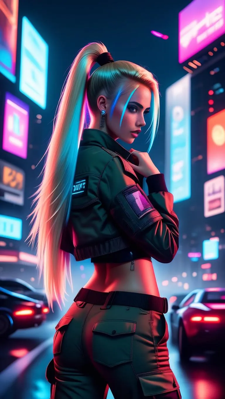 Generate a striking cyberpunk girl with long blonde hair featuring blue highlights. Clad in a cropped jacket and high-waisted cargo pants, she stands confidently against a vibrant neon cityscape with billboards and flying cars. Create this futuristic character image and scene on VividGo.ai.