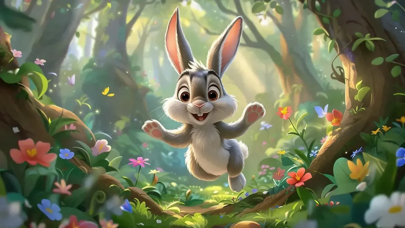 Generate Disney-style AI art of Benny the rabbit with fluffy white fur and a big pink nose, playing hide-and-seek in a lush green forest filled with colorful flowers. Magical Kingdom-inspired AI effects bring this whimsical scene to life. Try vivago.ai's creative tools for enchanting, professional-grade visuals.