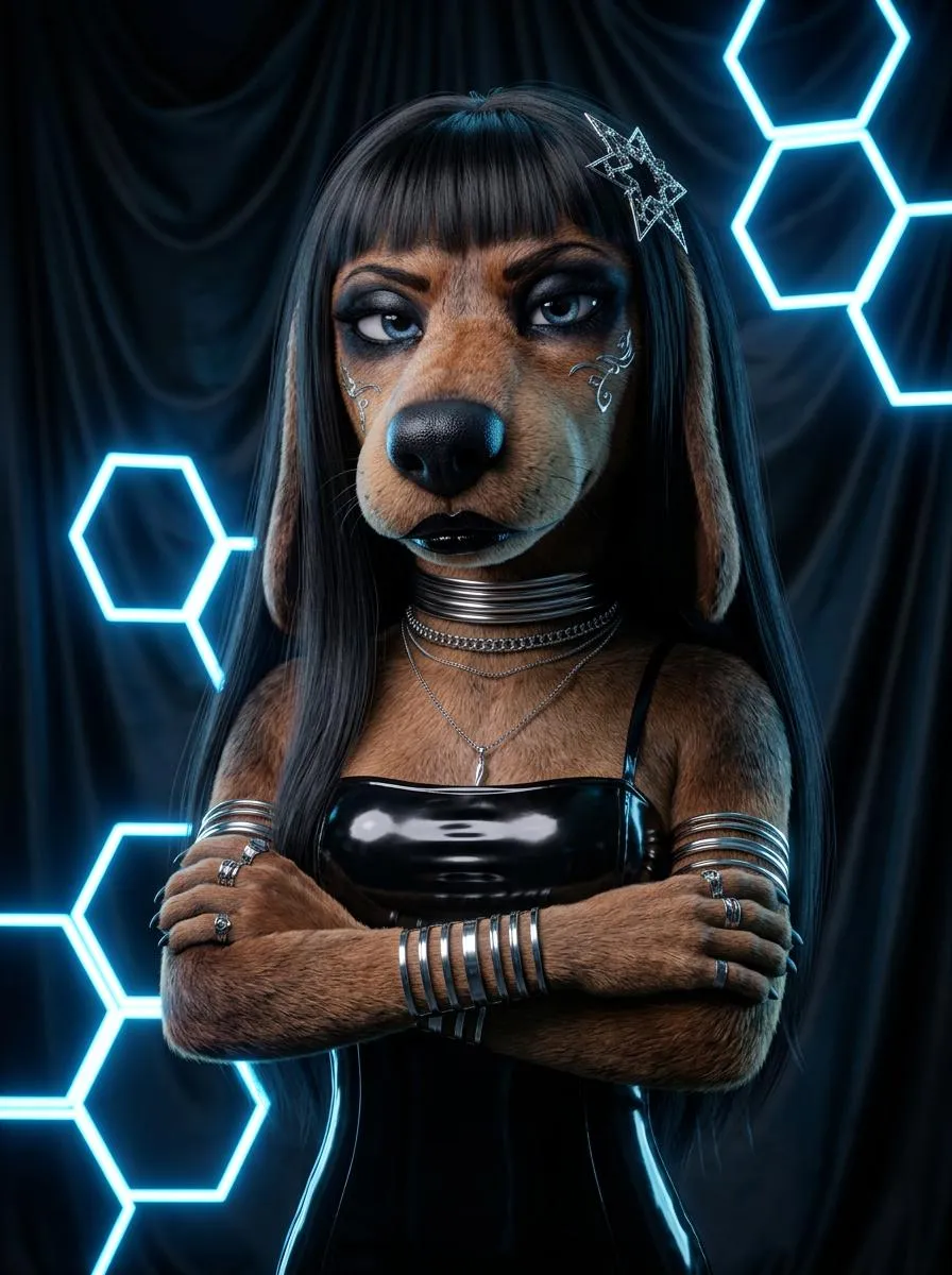 Generate photorealistic cyberpunk portraits with a dark gothic aesthetic. Create hyper-detailed, 8K images featuring futuristic neon-lit studios, glossy latex outfits, intricate silver accessories, and dramatic smoky makeup. Achieve cinematic lighting, cool blue neon rims, high contrast, and sharp focus using vivago.ai's AI image generator. Transform text prompts into stunning, ultra-realistic visuals.