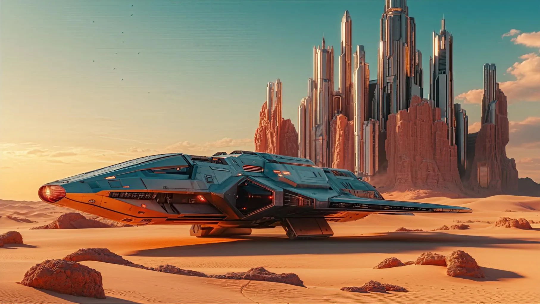 Generate a futuristic sci-fi castle in a desert landscape with a halo protective shield, steampunk fighter patrols, and metallic textures. AI-powered movie-quality rendering, cool tones, vibrant sci-fi colors, and intricate Cinema4D-style details for immersive, professional-grade steampunk visuals. Transform prompts into vivid futuristic worlds with vivago.ai.