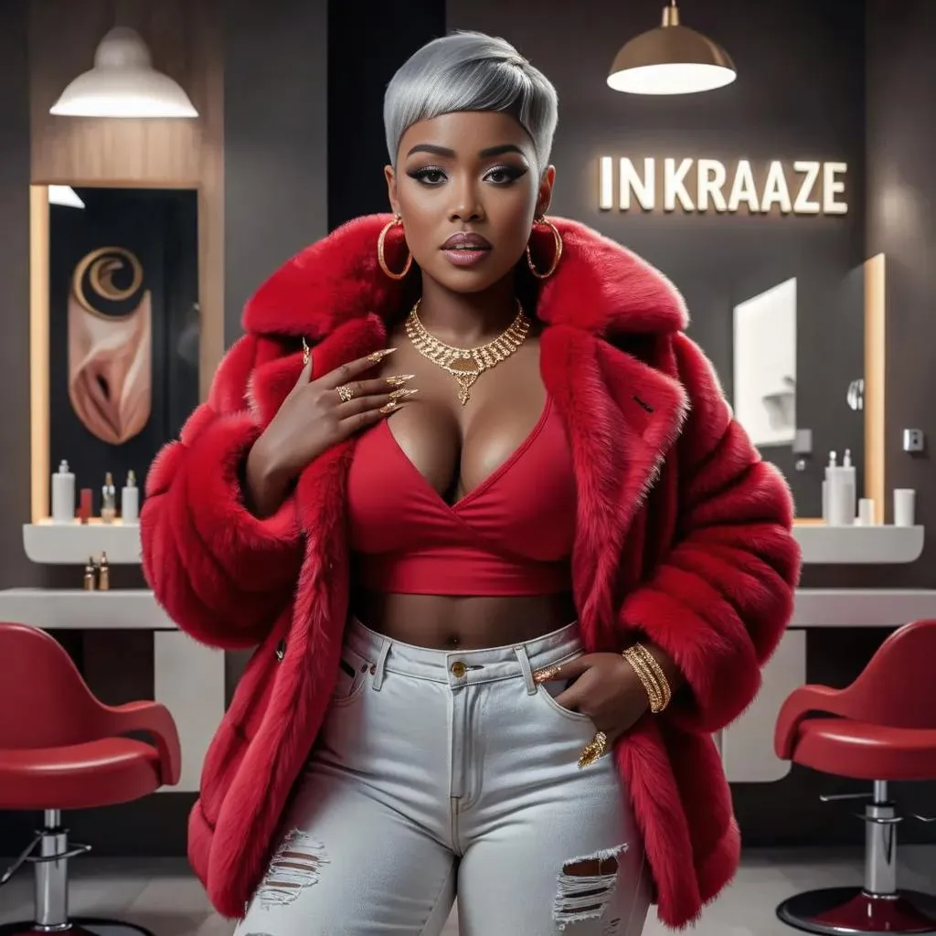 Generate a hyper-realistic AI image of a stylish plump ebony woman in a red fur coat, white jeans, and red boots, showcasing flawless makeup, platinum pixie hair, and luxury gold jewelry. Intricate details highlight a chic nail salon backdrop with INKKRAAZE LED signage, blending high-end fashion with vivid AI-generated realism.