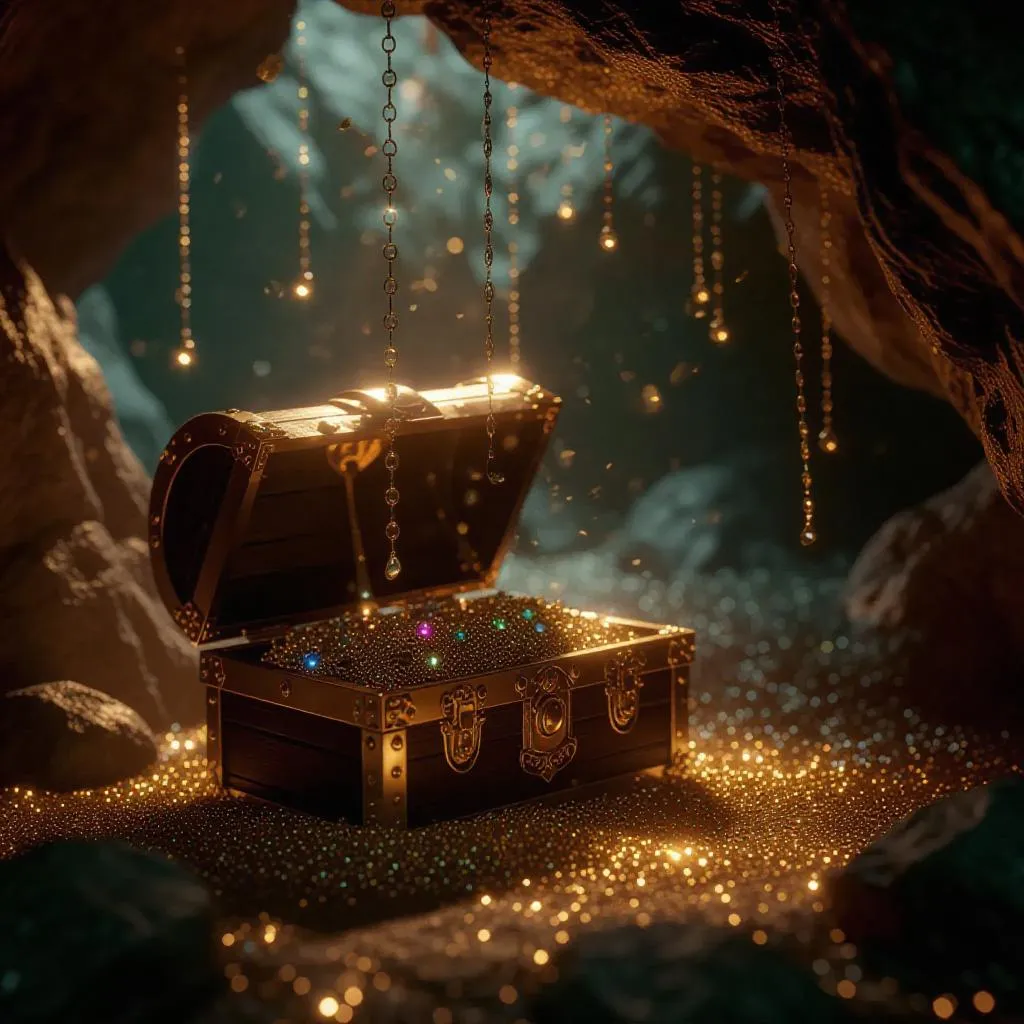 Generate cinematic AI visuals of a mystical cave treasure chest spilling jewels, bathed in soft illumination. Elevate storytelling with vivago.ai's advanced effects for professional-grade, enchanting imagery and seamless video generation.