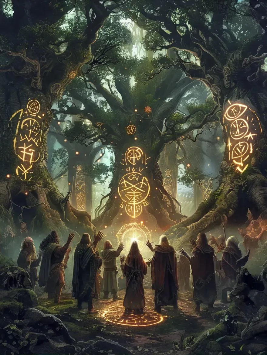Unlock AI-generated fantasy art: Mystical druid ritual in an ancient grove where elves, dwarves, humans, and half-orcs unite to heal battle-scarred lands. Glowing rune-covered trees, sacred circles, and earthy-robed figures channel magic. Create ethereal landscapes with Vivago.ai's AI image tools for spellbinding fantasy scenes.