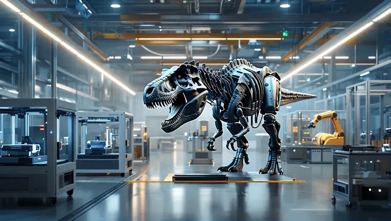 Generate a futuristic manufacturing scene where 3D printers and advanced robots assemble cars, iPhones, and dinosaurs. Explore AI-powered creative tools for stunning visuals, blending modern tech with prehistoric wonders. Perfect for industrial design and sci-fi concepts with professional-grade AI editing tools.