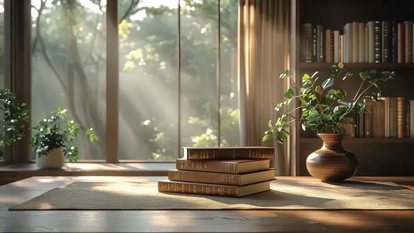 Generate a serene study room scene with three elegantly stacked books using VivaGo.ai's AI image tools. Transform text prompts into tranquil, aesthetic visuals for peaceful workspace inspiration or creative projects. Elevate your designs with professional AI-generated imagery, blending simplicity and beauty effortlessly. Perfect for digital art, branding, or calming interior concepts.